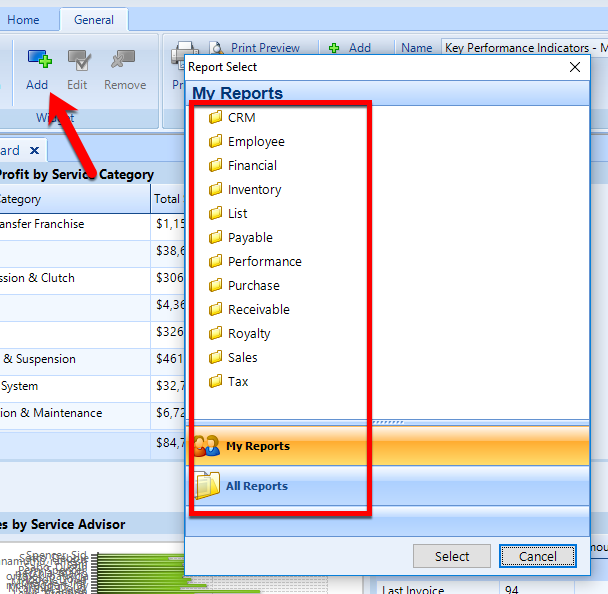 To add a widget, click the Add button in the Widget section of the ribbon, as shown in the figure below. In the popup, locate and then double-click to choose a report that will support this widget.